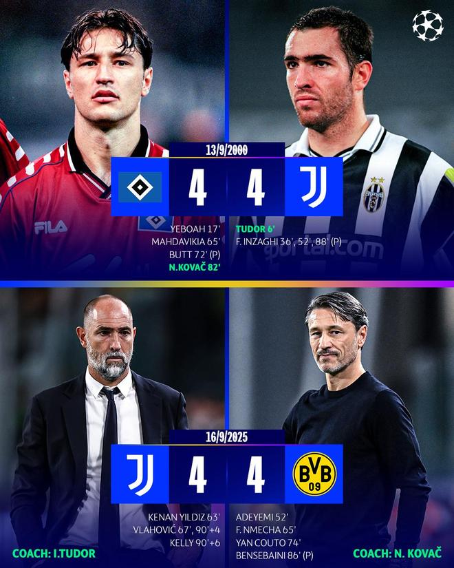 当时图多尔效力的球队同样是尤文图斯,而科瓦奇则效力于汉堡。当时尤文与汉堡在欧冠第一轮小组赛相遇,两队首回合交手中,比分同样为4-4。值得一提的是,二人还分别取得了进球。