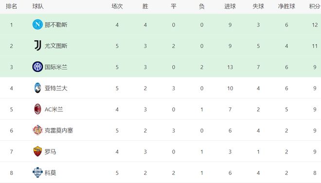 在积分榜上,4战全胜的那不勒斯以12分排名榜首。尤文图斯只拿到1分,总积分是11分,排第2。国际米兰赢球之后,战绩是3胜2负,拿到9分,升到第3名。亚特兰大、AC米兰、克雷莫内塞和罗马都是9个积分,排名第4到第7名。科莫8分排第8。