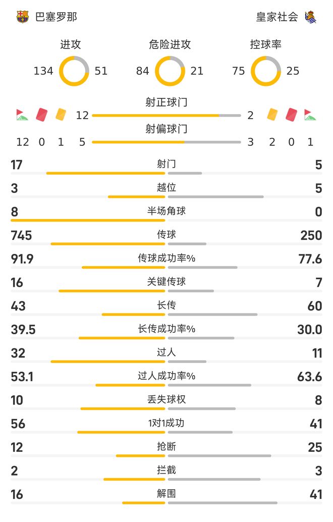 巴萨vs皇家社会全场数据:射正122,控球率高达75%