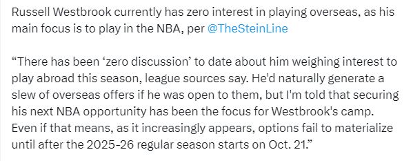 北京时间10月13日,距离新赛季开打还有9天,9届全明星威少仍未加盟任何球队,据名记Marc Stein报道,自由球员威少目前不愿意前往海外打球,专注回归NBA。
