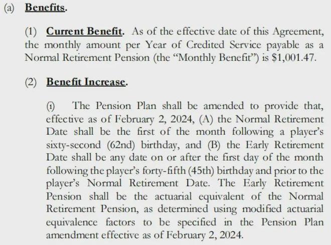 根据NBA球员工会最新劳资协议(CBA),球员养老金采取阶梯式分档制度,领取年龄不同,金额差距显著:第一档(45—50岁):每月可领306.24美元 × 效力年限 × 2/3第二档(50—62岁):每月可领306.24美元 × 效力年限第三档(62岁及以上):每月可领1666.7美元 × 效力年限按照姚明的9年NBA生涯计算:45岁至50岁期间,他每月可领取约1838美元;50岁至62岁期间,每月约2757美元;若等到62岁后再领取全额养老金,每月可高达1.5万美元(约合人民币11万元)。NBA退役球员协会前执行官斯科特·罗谢尔曾表示,虽然球员最早可在45岁开始领取养老金,但领取越早,金额折算越低;若能延至62岁才领取,总额会大幅增加。