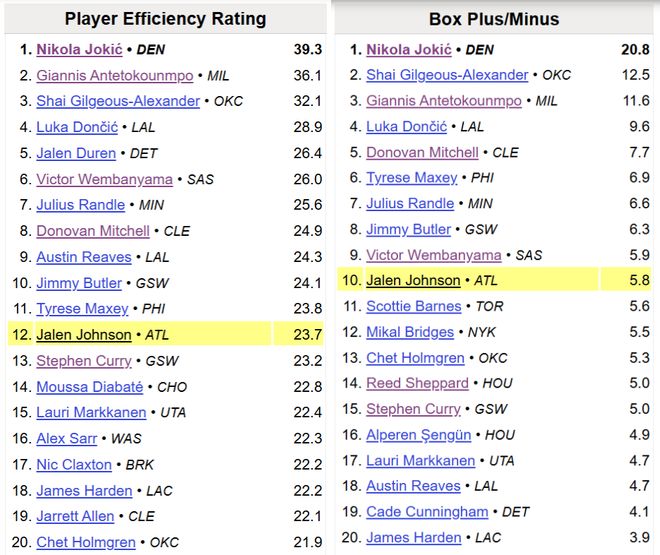 高阶数据方面,也能看出杰伦约翰逊正在展现一些不同的东西:目前杰伦约翰逊的PER值是23.7、BPM是+5.8,这两项都是生涯最高(此前最高PER值17.3、BPM+1.9),而且分别排在全联盟第12和第10。