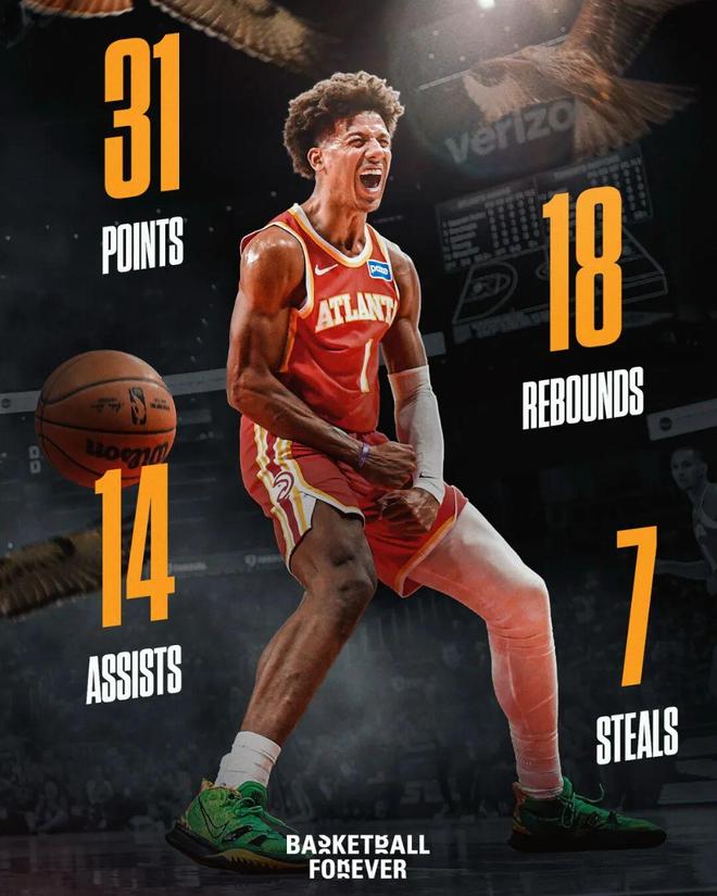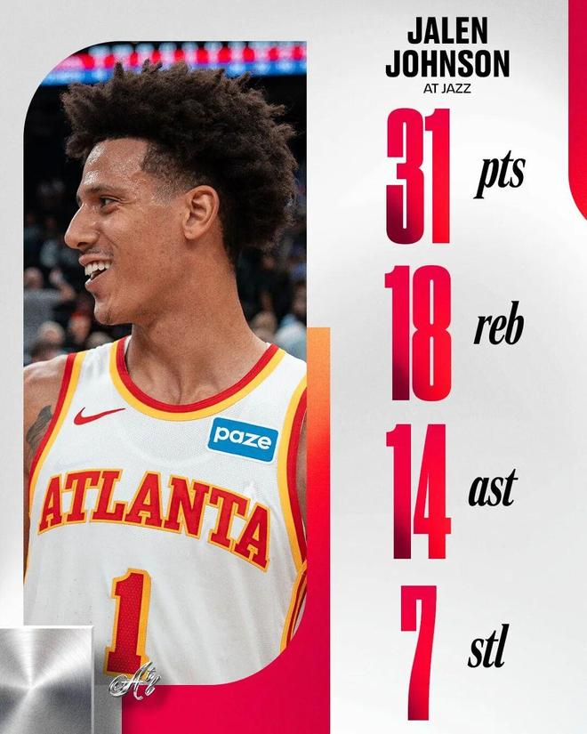 大概是什么概念呢?这场的杰伦约翰逊:——得分、篮板、助攻、抢断四项数据全是生涯新高——半场结束,20分5篮板8助攻5抢断,NBA史上第一位半场20+5+5+5断的球员——全场结束,31分18篮板14助攻7抢断,NBA史上第一位达成该数据的球员各位可能不知道这个数据有多难,算上这场的杰伦约翰逊,NBA历史上一共只有7名球员达成过7次30分三双+7次抢断,罕见程度比单场60+、70+还要高。