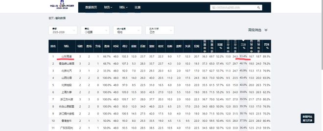 本赛季三场俱乐部杯过后,山东男篮场均三分命中率高达53.4%,该数据暂居联盟第一,比上赛季常规赛场均34.3%的命中率足足高出19.1%。