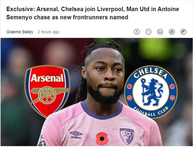 北京时间12月24日,据TEAMtalk独家获悉,阿森纳已就签下伯恩茅斯的塞梅尼奥展开初步询价;同时罗马诺,切尔西同样已主动联系球员方面,询问其现状。目前,曼城和曼联在争夺战中处于领先,已与球员及其随行人员进行了长时间会谈。利物浦仍保持兴趣,但并未跟进接触;热刺也保留关注,但难以说服这位边锋加盟,已被排除在竞争之外。