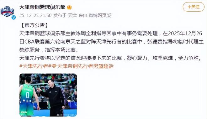 没错,这就是天津荣钢篮球俱乐部,昨晚深夜,他们官宣:主教练周金利指导因家中有事务需要处理,在2025年12月26日CBA联赛第六轮南京天之蓝对阵天津先行者的比赛中,张德贵指导将临时代理主教练职务,指挥本场比赛。大家懂得都懂,很多俱乐部对教练下课,都用家中有事或是身体不适来表述。显然周金利教练并不是因为家中有事,而是切切实实的下课了。